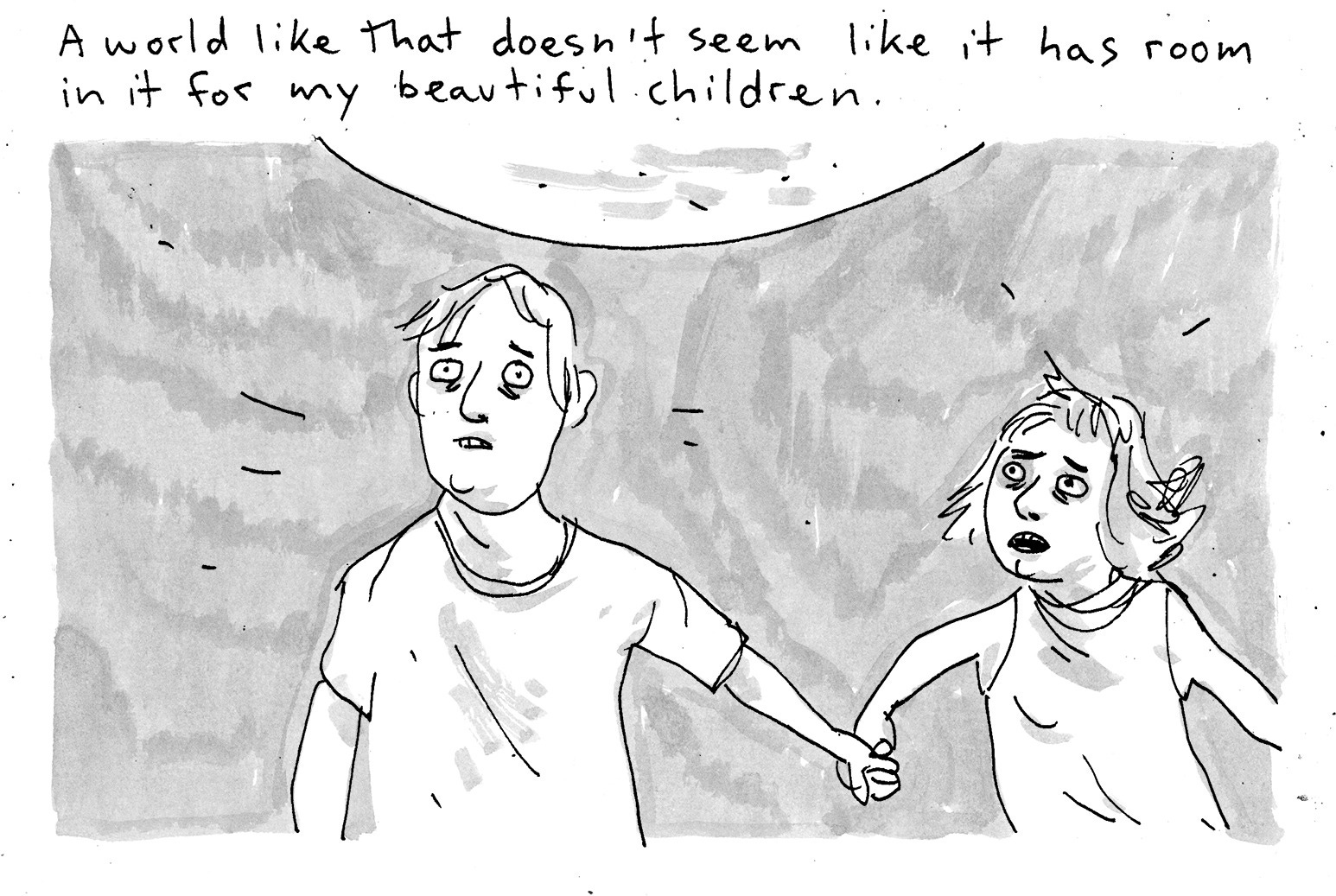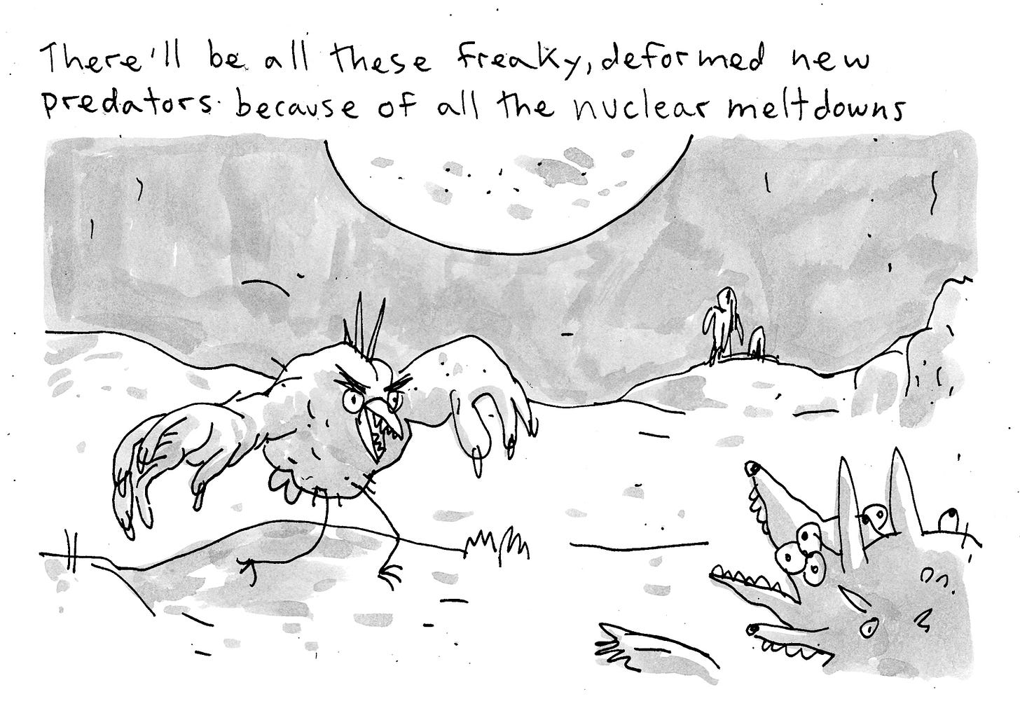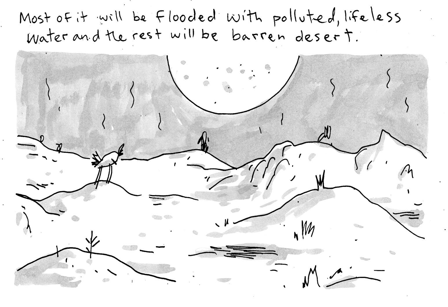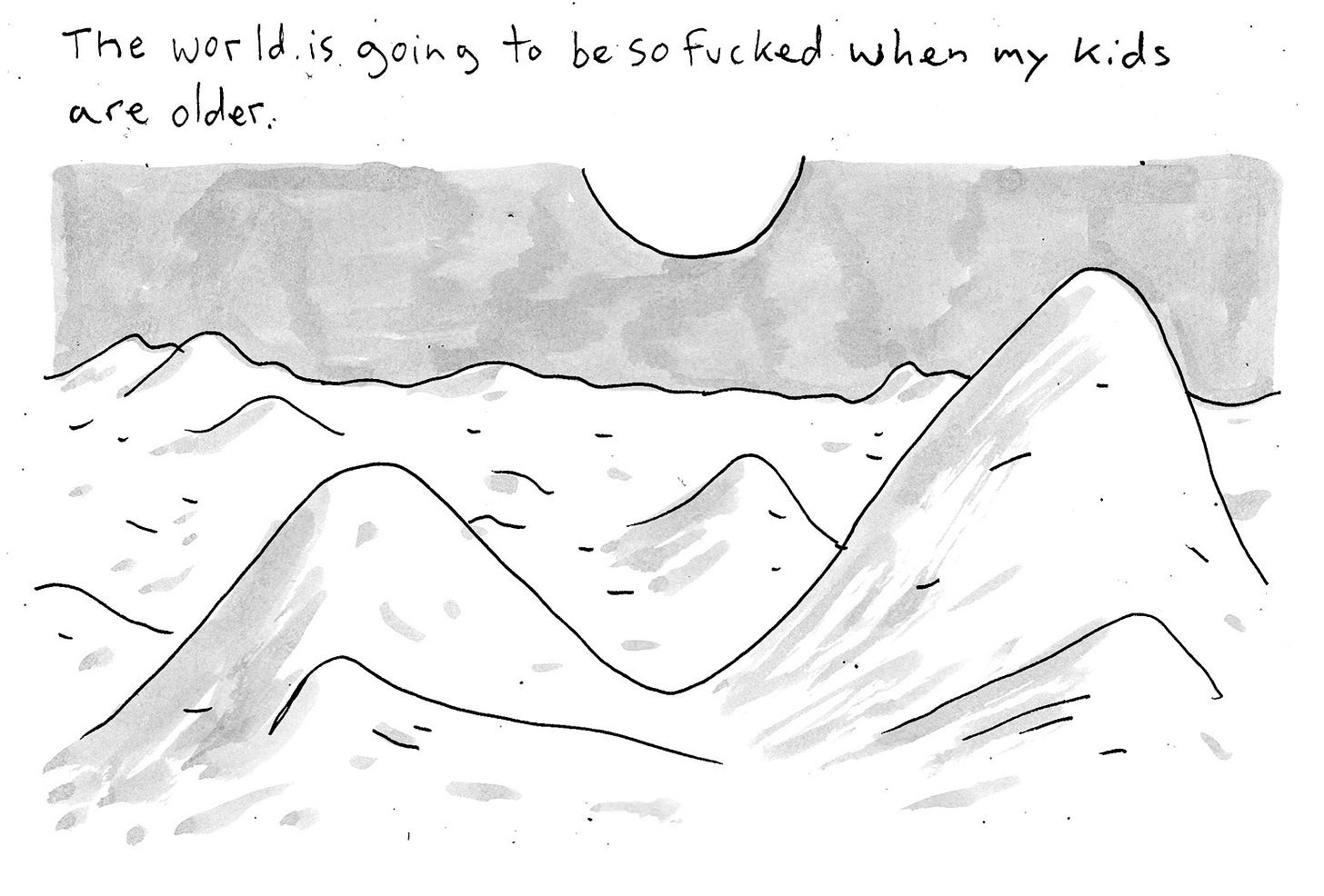 With this comic, The Future Is Shit, I wanted to figure out how to tell a story about my climate change fears that was true, but also fun to read. I wanted to take climate change seriously without having to be serious, if that makes sense? I had a lot of fun making it but it really solidified my fear of both climate change and giant, creepy future-wolves.