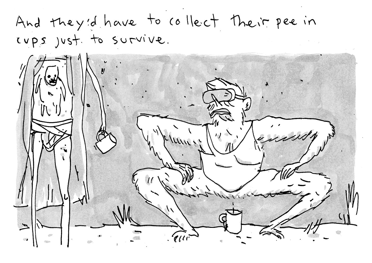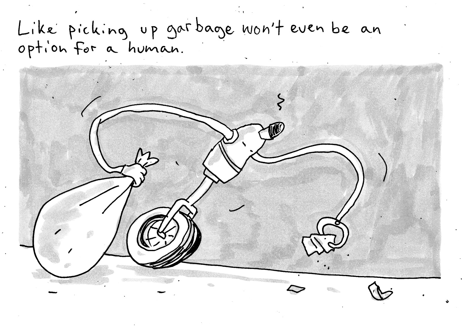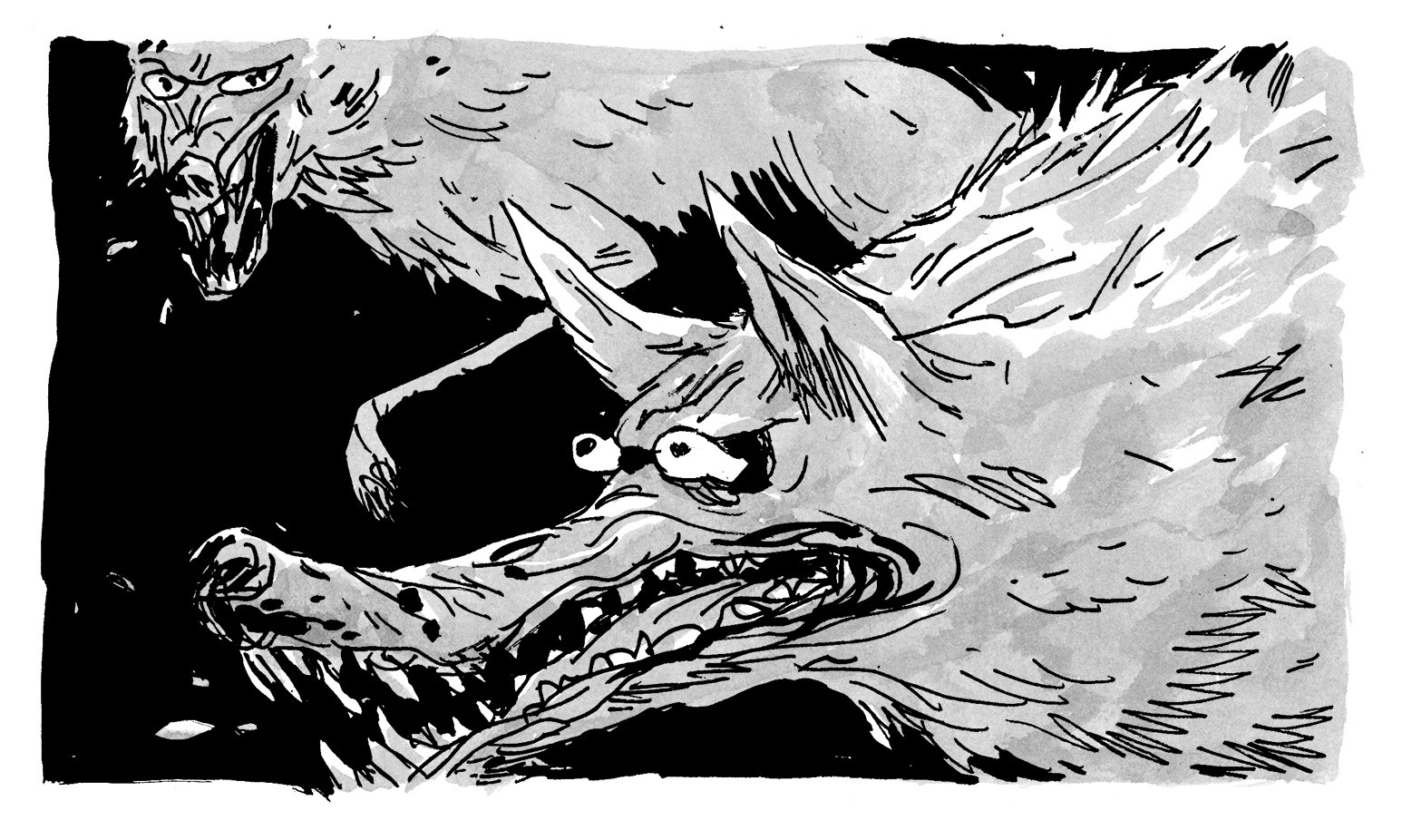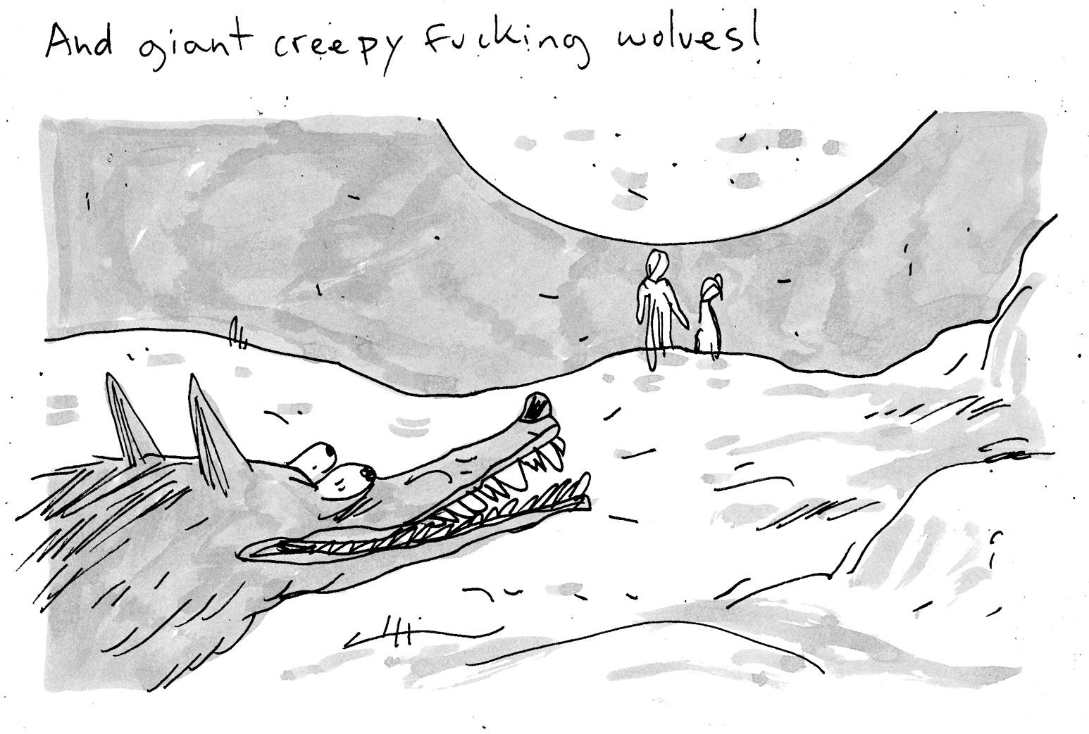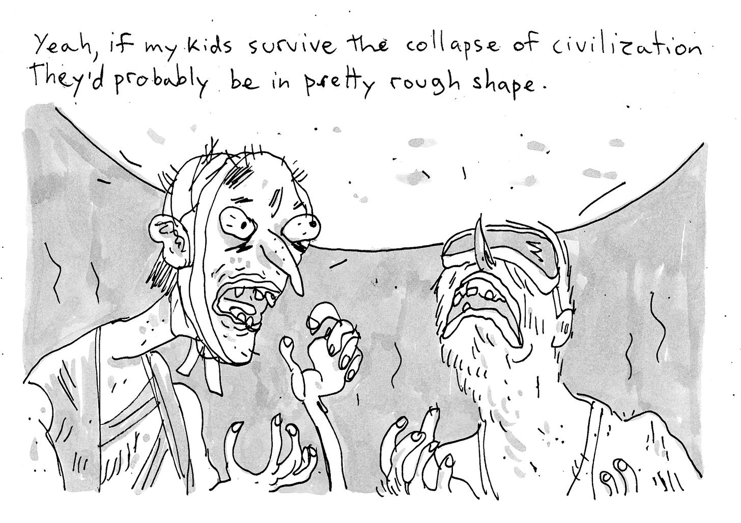 With this comic, The Future Is Shit, I wanted to figure out how to tell a story about my climate change fears that was true, but also fun to read. I wanted to take climate change seriously without having to be serious, if that makes sense? I had a lot of fun making it but it really solidified my fear of both climate change and giant, creepy future-wolves.