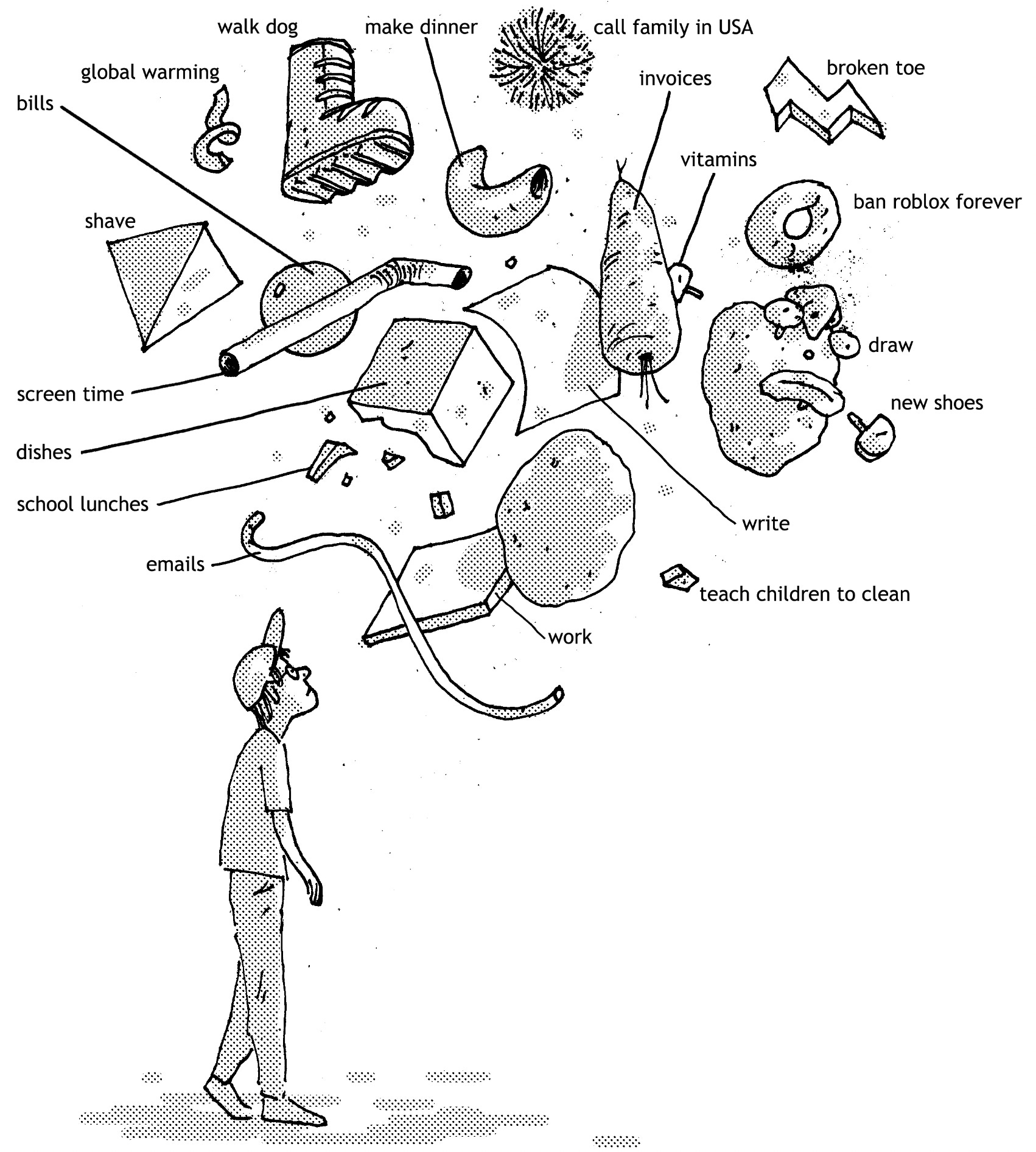 Pick a topic and write down all of it’s component parts. Then, pair the written components with parts of your drawing. Think about how the drawing and topic relate. Does it relate? What parts get included? Does the drawing reconextualise the topic or visa versa?