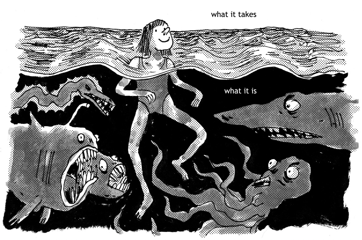 This exercise felt a little like cheating to me. I didn’t worry about story! I didn’t worry about continuity! I drew some of these while watching TV, others while I had a coffee and my kids jumped on a trampoline, and still others sitting on a park bench while my dog ran around sniffing butts and rolling in possum wee. I’m on vacation (it is currently New Year’s day) and it was nice not to think about the drawings too much. And while they didn’t feel particularly purposeful when I initially drew them, it felt good to come back and play with text and add a bit of depth and meaning later.
